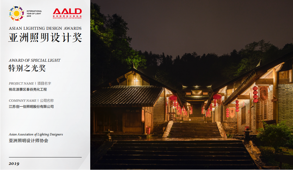 歷經(jīng)7個(gè)月的篩選角逐,2019年亞洲照明設(shè)計(jì)獎(jiǎng)共評出57個(gè)獲獎(jiǎng)項(xiàng)目,包括亞洲之光獎(jiǎng)、非凡之光獎(jiǎng)、優(yōu)異之光獎(jiǎng)、特別之光獎(jiǎng)。江蘇創(chuàng)一佳照明股份有限公司聯(lián)合旗下設(shè)計(jì)公司光華照明設(shè)計(jì)憑借“桃花源景區(qū)秦谷亮化工程”榮獲特別之光獎(jiǎng)項(xiàng)。